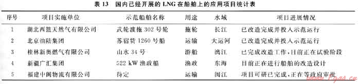 2009年4月,全球首套LNG船用燃料儲(chǔ)存供氣系統(tǒng)由張家港富瑞特種裝備股份有限公司下屬的控股子公司張家港韓中深冷科技有限公司研發(fā)試制成功并順利交付客戶(hù)挪威漢姆沃斯公司。同時(shí),在國(guó)內(nèi)LNG船舶油改氣項(xiàng)目也有了長(zhǎng)足的發(fā)展。截至目前,已經(jīng)先后有湖北西籃、北京油陸、桂林新奧燃?xì)狻⑿陆畯V匯、福建中閩等多家能源企業(yè)為了搶占LNG在船舶領(lǐng)域的應(yīng)用市場(chǎng)而開(kāi)展了船舶燃料油改氣示范項(xiàng)目的運(yùn)作(表13)。
