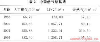 我國(guó)將天然氣發(fā)展視為一項(xiàng)能源結(jié)構(gòu)調(diào)整和大氣環(huán)境改善的重要舉措。中國(guó)城市燃?xì)膺M(jìn)入了天然氣階段,20世紀(jì)90年代末至21世紀(jì)初,中國(guó)建設(shè)了一批天然氣輸送工程,推動(dòng)了城市燃?xì)獾陌l(fā)展——城市燃?xì)馄占奥侍岣?、燃?xì)饨Y(jié)構(gòu)發(fā)生了很大變化(表2)[3]。