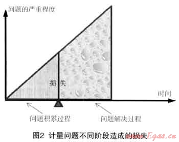 一般在發(fā)生卡表計量問題的情況下,燃?xì)馄髽I(yè)往往是承擔(dān)損失的一方,由于計量問題所帶來的流量損失,與“問題的程度”和“發(fā)現(xiàn)及處理問題所用的時間”成正比關(guān)系。計量問題的出現(xiàn)往往是時間積累的結(jié)果,如圖2所示,計量問題經(jīng)過一段時間的積累,達(dá)到一定的“度”,從而引起關(guān)注,在問題積累的過程中已經(jīng)給企業(yè)帶來了一定的損失,問題出現(xiàn)后往往還需要相當(dāng)一段時間加以解決,而解決問題的過程無疑將積累更多的損失。燃?xì)夤緸榇怂冻龅臅r間成本相當(dāng)可觀。