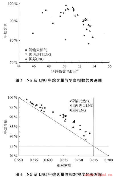 同樣,限定相對密度的范圍與限定甲烷的最低含量具有同樣的功效。甲烷值和辛烷值有非常確定的關系,是抗爆燃的重要參數(shù)。圖3、4分別給出了甲烷含量與華白指數(shù)和相對密度的關系。