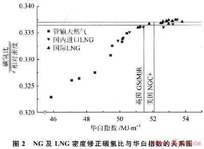 對華白指數(shù)限定范圍的控制是天然氣利用的安全性、環(huán)境排放和效率的保證。燃氣的碳氫比數(shù)決定了不完全燃燒指數(shù)的大小或燃燒的C0排放量。圖2給出了相對密度修正的碳氫比和華白指數(shù)的關系。由此可見控制華白指數(shù)范圍與控制碳氫比的變化一樣,具有限定不完全燃燒指數(shù)或黃焰指數(shù)的同樣功效。圖2中GS(M)R是英國燃氣安全管理規(guī)范“Gas Safety(Management)Regulations”的縮寫。
