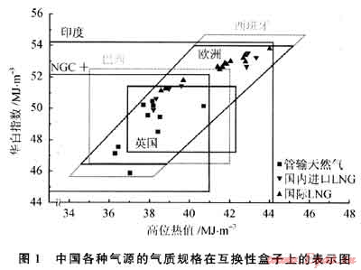 由華白指數(shù)、發(fā)熱量和相對密度的控制范圍構(gòu)成了互換性盒子,圖1將中國目前和將來管輸天然氣和氣化LNG的燃燒特性參數(shù)表示在互換性盒子上,比較了典型地區(qū)和國家的互換性標準控制域。歐洲一些國家根據(jù)本國的特殊情況制定各自的標準,如西班牙標準比較寬泛,華白指數(shù)范圍大于歐洲和諧標準;而英國較嚴,其華白指數(shù)限定要比歐洲和諧標準嚴格得多。
