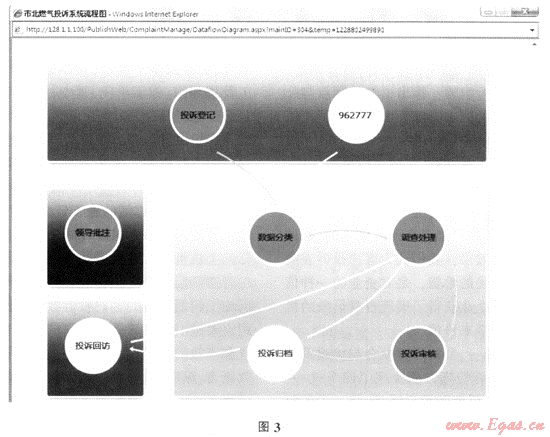 由于每條投訴信息均規(guī)定了統(tǒng)一的處理流程,因此,我們可以通過系統(tǒng)查詢某條信息正處于投訴處理的哪個階段,并以不同顏色予以區(qū)分,其中,綠色表示已經(jīng)通過的階段,白色表示尚未完成的階段,并且,某條投訴若上級或領(lǐng)導(dǎo)作過批注,則以紅色表示,具體如圖3所示:
