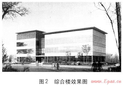綜合樓建筑風(fēng)格簡潔現(xiàn)代,結(jié)合總圖采取矩形布局,建筑朝向?yàn)槟媳毕?,長邊與廠外主要道路平行。建筑體型采用三個不同高度的體塊相間穿插布置,顯得錯落有致。建筑外檐采用帶形熱反射玻璃幕墻與鋁合金金屬幕墻相結(jié)合,線條流暢,給人一種十足的現(xiàn)代感。局部安放空調(diào)室外機(jī)組的屋面采用金屬百葉做圍護(hù)結(jié)構(gòu),既對設(shè)備起到了視覺上的遮擋作用,本身又成為外立面不可或缺的重要組成部分,可謂一舉兩得??v觀整個建筑,本身并不作繁冗裝飾,而是采用豐富的體型、干凈利落的細(xì)部刻畫以及協(xié)調(diào)大方的色彩取勝。而鋁合金金屬幕墻、熱反射玻璃幕墻、鋁合金裝飾百葉這些新材料的運(yùn)用,又使整個建筑顯得既簡潔明快,又不乏時代感,反映了工業(yè)建筑的精神,現(xiàn)代企業(yè)的氣質(zhì)也在這里得以彰顯。綜合樓效果圖見圖2。