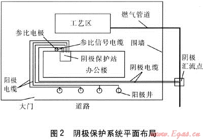2008年為了保證福建LNG福州天然氣項(xiàng)目按期投產(chǎn),福州華潤(rùn)燃?xì)庥邢薰驹诟V莩情T(mén)建設(shè)管輸天然氣門(mén)站,同時(shí)為保護(hù)市政中壓燃?xì)夤艿?,在城門(mén)門(mén)站新建外加電流深井陽(yáng)極陰極保護(hù)系統(tǒng)。該陰極保護(hù)系統(tǒng)平面布局見(jiàn)圖2。