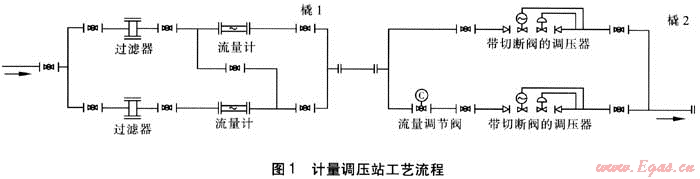 計(jì)量調(diào)壓站工藝流程是:接收高壓管網(wǎng)來(lái)氣,經(jīng)過(guò)濾、計(jì)量、流量調(diào)節(jié)、調(diào)壓后向下游中壓管網(wǎng)供應(yīng)天然氣。計(jì)量調(diào)壓站工藝流程見(jiàn)圖1。