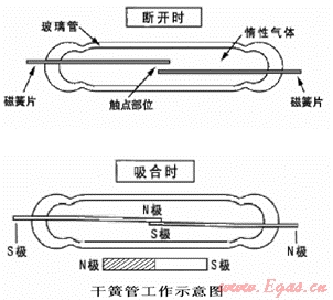 干簧管由一對由磁性材料制造的彈性磁簧組成,磁簧密封于充有惰性氣體的玻璃管中,磁簧端面互疊,但留有一條細(xì)間隙。磁簧端面觸點(diǎn)鍍有一層貴金屬,使開關(guān)具有穩(wěn)定的特性和延長使用壽命。