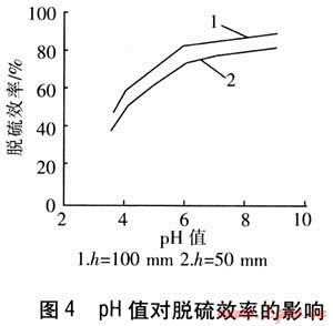 脫硫劑pH值是影響脫硫效率的一個(gè)重要參數(shù),也是脫硫過程中可調(diào)的參數(shù)。選擇適當(dāng)?shù)膒H值,不僅能夠保證足夠高的脫硫效率,還可以降低運(yùn)行成本,保證脫硫系統(tǒng)的穩(wěn)定運(yùn)行。實(shí)驗(yàn)選擇的石灰脫硫劑體積分?jǐn)?shù)為10%;h為高液位溢流管管口距沖擊管出口的距離,分別取50、100mm;低液位溢流管管口距沖擊管出口的距離為20mm。脫硫劑pH值對(duì)脫硫效率的影響見圖4。由圖4可知,脫硫劑pH值為3.8~6.0時(shí),脫硫效率隨pH值的增加變化較快;pH值>6時(shí),脫硫效率變化緩慢。h=100mm時(shí),噴射速度提高,引射的液量增加,鼓泡通過液層的高度和運(yùn)動(dòng)的距離增加,氣液交換的時(shí)間延長(zhǎng),脫硫效率較高,阻力隨之增大。