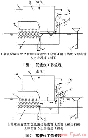 ① 雙液位噴射鼓泡煙氣脫硫除塵裝置適用于集中供熱鍋爐的煙氣脫硫除塵,當(dāng)?shù)拓?fù)荷和封火狀態(tài)時(shí),低液位溢流管能保證低液位與沖擊管出口處留有煙氣通道。