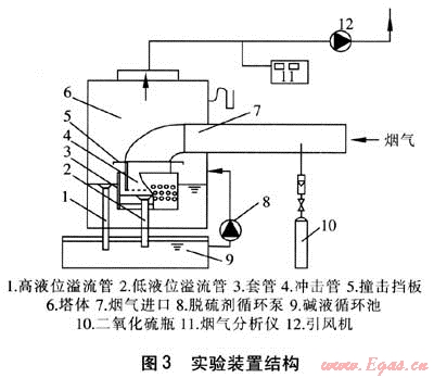 以石灰漿液為脫硫劑的雙液位噴射鼓泡煙氣脫硫除塵實(shí)驗(yàn)裝置結(jié)構(gòu)見圖3,模擬煙氣垂直進(jìn)入沖擊管在出口處卷吸液體向上流動(dòng),此過程中煙氣被加濕冷卻,煙氣中的二氧化硫和煙塵與脫硫劑接觸被吸收和去除。經(jīng)除塵和脫硫后的煙氣轉(zhuǎn)向向上流動(dòng),在撞擊擋板作用下水霧被分離,凈化后的煙氣由引風(fēng)機(jī)排出。脫硫劑循環(huán)泵將脫硫劑不斷補(bǔ)入塔內(nèi)以保證塔內(nèi)液位,正常工作時(shí)脫硫劑通過高液位溢流管進(jìn)行循環(huán)。調(diào)整二氧化硫瓶的閥門,可以改變二氧化硫濃度,通過測(cè)壓管可以測(cè)得在不同煙氣流量下的裝置阻力。煙氣分析儀可以測(cè)出煙氣中二氧化硫濃度的瞬時(shí)值和積分值。實(shí)驗(yàn)規(guī)模:模擬煙氣量200~1000m3/h,煙氣進(jìn)口處二氧化硫質(zhì)量濃度700~850mg/m3,空塔流速1~3m/s。