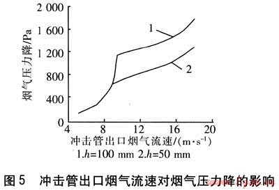 沖擊管出口煙氣流速對(duì)煙氣壓力降的影響見圖5。由圖5可知,當(dāng)h=50mm、沖擊管出口煙氣流速為5.0~8.4m/s時(shí),液位由低液位溢流管控制,氣體通過沖擊管出口與液位高度為20mm的空間發(fā)生氣體卷吸液體的現(xiàn)象。隨著流速的增大卷吸現(xiàn)象加劇,被卷吸的液體量增加,氣液接觸主要在上升通道內(nèi)進(jìn)行,氣體壓降隨流速增加。當(dāng)沖擊管出口煙氣流速超過8.4m/s時(shí),液位開始下降,低液位溢流管失效,沖擊管出口與液位形成的空間變大,上升通道內(nèi)煙氣流速迅速提高,動(dòng)壓加大、靜壓減小,套管兩側(cè)形成壓力差,套管外側(cè)液體通過排孔流入上升通道與上升氣流混合。下降氣流在此空間轉(zhuǎn)向流動(dòng),速度滯流動(dòng)壓轉(zhuǎn)化為靜壓,在排孔兩側(cè)形成壓力差,煙氣通過排孔進(jìn)入液相形成鼓泡。當(dāng)沖擊管出口流速為18m/s時(shí),煙氣壓力降為1300Pa。