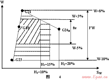 例如英國經(jīng)過流動試驗室對1200個天然氣燃具進(jìn)行試驗,發(fā)現(xiàn)華白數(shù)每遞增1.5MJ/m3,熱水器與鍋爐煙氣中的CO含量大約增加1倍。因此決定燃?xì)饣Q域的華白數(shù)上限為3%,下限為-5%。非正常的界限為:上限8%;下限-10%。英國使用SNG(代用天然氣),需要用IGU的析碳界限氣G24B檢驗。為了避免析碳,英國要求界限氣中H2含量正常界限為10%,非正常界限為15%。同時利用W-SW燃?xì)饣Q圖表達(dá)了燃?xì)饣Q域(見圖4),已經(jīng)把IGU規(guī)定的G24B和歐共體的G222排除在外。圖4中的斜線為正?;Q域??梢娪烊粴獾幕Q域小于IGU和歐共體的天然氣分類的范圍。如果考慮燃?xì)鉄嶂挡辉试S變化過大時,燃?xì)饣Q域,還要進(jìn)一步縮小。實際上,燃?xì)饣Q域是根據(jù)燃具的適應(yīng)域等因素決定的,當(dāng)時英國燃具的抗析碳的能力差,縮小了互換域。以上是上個世紀(jì)英國使用含H2多的SNG(代用天然氣)作為補(bǔ)充氣源的情況[11]。由此可見,界限氣只是給出了互換域邊界的輪廓不等于互換性已經(jīng)解決。