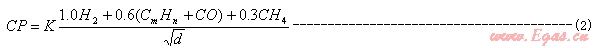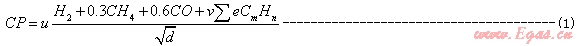 1.燃燒勢(CP)是反映燃具燃燒狀態(tài)的燃?xì)馓匦詤?shù)。它既反映燃燒速度對離焰、回火的影響,同時還反映火焰高度對煙氣中CO含量的影響。燃燒勢不是燃燒速度。CP值與燃燒速度也不單純呈比例關(guān)系。這樣看來稱其為燃燒速度指數(shù)不是非常合適,也容易與韋弗燃燒速度指數(shù)相混[3] 。
