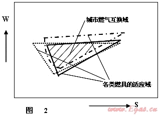 2. 城市燃?xì)饣Q域:一個城市有多種不同用途的燃具。每種燃具都有自己的燃具適應(yīng)域。將這些適應(yīng)域,集中在一個坐標(biāo)圖上(見圖2),就可以得到中間斜線的燃?xì)饣Q域。城市供應(yīng)的燃?xì)獗仨氃谶@些燃具的適應(yīng)域的范圍內(nèi)??梢娙?xì)饣Q域是受燃具適應(yīng)域制約的。其實互換性和適應(yīng)性的目的都是保證燃具正常工作,是一個事物的兩個方面。互換性是對城市燃?xì)庹f的;適應(yīng)性是對燃具說的。在討論時不要混淆。