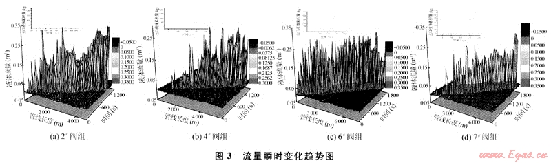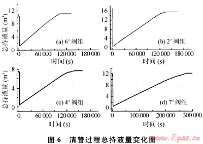 從圖3可以看出隨著清管的進行,清管器下游段塞長度逐漸增加。在下游段塞還沒有到達終端之前,終端的液體流量基本保持在0.0003m3/s左右不變,隨著清管的進行,當清管器前面的段塞到達終端后,終端液體流量變化十分劇烈,各閥組終端液體流量由零迅速增加,通過終端的液體累計量呈線性增長,各閥組出口液體累積量為:4510kg(6#閥組)、13674kg(2#閥組)、6385.6kg(4#閥組)、11012kg(7#閥組);段塞到達終端后各閥組段塞收集時間為:101.1s(6#閥組)、100.8s(2#閥組)、40.1s(4#閥組)、40.3s(7#閥組)。當清管結束后,終端液體流量接近零,幾乎全為氣體即出現(xiàn)了所謂的段流現(xiàn)象。在整個清球過程中,液體流量在地形起伏較大的上升管段和下降管段的凹凸結合處會發(fā)生較大的波動。這是流體在上升管路處清管器前端液體由于自重堆積造成的結果;而在下降管路處由于清管器前后端液體自重及清管器自重的影響使清管器前端液體流速迅速增加。這種現(xiàn)象對高程變化較大的4個閥組尤為明顯。