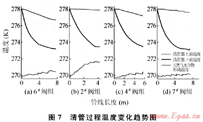 分析,獲取了清管后各閥組管線恢復穩(wěn)態(tài)的時間。采用瞬態(tài)分析方法對清管器運行中溫度變化研究的結論表明:各閥組在清管過程中沒有天然氣水合物的形成。進一步驗證了清管節(jié)流理論的正確性。