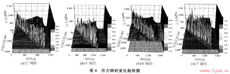各閥組由于地形變化起伏大,壓力波動隨著管線的起伏也發(fā)生了較大的變化(見圖4)。從圖中可以看到壓力波動的位置出現(xiàn)在段塞出現(xiàn)處和管線走向發(fā)生改變的地方。在通球過程中各閥組流體壓力變化具有共同的特征:當清管器放入管道后,由于清管器后部流體被阻,上游氣體被壓縮使清管器上游壓力急劇升高,清管器運動后,上游重新恢復到新的穩(wěn)態(tài);清管器下游由于流體連續(xù)性的中斷,開始時下游流體壓力急劇下降,清管器經(jīng)過后,由于氣體得以補充,原下游下降的壓力開始上升。清管器剛經(jīng)過時,在清管器上游一定長度的管段內幾乎沒有液體存在,使清管器上游壓力幾乎相等,僅由于阻力損失使壓力出現(xiàn)微小的差別;當清管操作完成后,各管段經(jīng)過一段時間重新達到了新的穩(wěn)態(tài)。