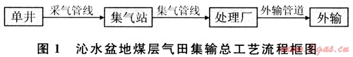 為了更好地開發(fā)建設(shè)沁水盆地煤層氣氣田,我們依據(jù)開發(fā)方案、煤層氣性質(zhì)、當(dāng)?shù)刈匀粭l件以及商品氣需求和流向等,并借鑒長慶氣區(qū)蘇里格氣田天然氣集輸工程的實(shí)踐經(jīng)驗(yàn),制定了沁水盆地煤層氣田地面集輸總工藝流程[1],如圖1所示。為了更深入地了解沁水盆地煤層氣田地面集輸工藝特點(diǎn),以蘇里格氣田天然氣集輸工程為對比,重點(diǎn)介紹了沁水盆地煤層氣田開發(fā)方案所提供的氣井基本參數(shù)、地面建設(shè)采用的井場、采集系統(tǒng)、集氣站場及處理廠工藝。