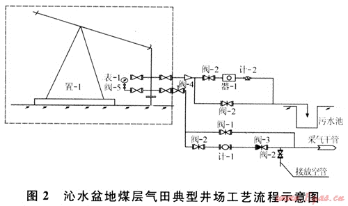 采用套管采氣、油管采水的井場工藝。井口由抽油機(jī)將地層水采出,通過消氣器將水中攜帶的氣體分離,經(jīng)水表計(jì)量后排至井場污水池中。煤層氣從煤層中解吸后由套管采出,通過井場智能旋進(jìn)流量計(jì)計(jì)量后,經(jīng)采氣管線輸送至集氣站。井場設(shè)置放空火炬及排采放空接口,在排采及事故時(shí)將煤層氣放空焚燒。井場工藝流程圖見圖2所示。