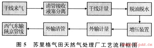 原料氣進(jìn)廠前設(shè)緊急截?cái)嚅y,可在中央處理廠或集氣干線緊急情況下的自動(dòng)切斷。氣體先進(jìn)入集氣裝置經(jīng)過濾分離器分離出攜帶的液體及粉塵等雜質(zhì),經(jīng)計(jì)量后輸往增壓裝置,再進(jìn)入脫水裝置,脫水后的凈化氣計(jì)量后去輸氣管道首站進(jìn)入就近的西氣東輸主管道。沁水盆地中央處理廠工藝流程框圖見圖6。