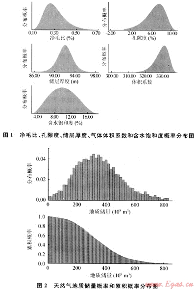 該實例為我國西部某氣田實際數(shù)據(jù)。由地球物理測井解釋和巖心、流體取樣實驗得到已鉆評價井的靜態(tài)數(shù)據(jù),包括儲層厚度,凈毛比(NTG)、儲層孔隙度、含水飽和度、氣體體積系數(shù)等,采用容積法儲量計算公式和Crystall ball[5]蒙特卡羅模擬方法計算氣藏地質(zhì)儲量。