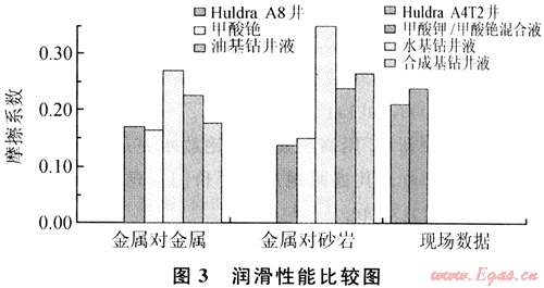 鉆井液的潤滑性已成為一個日益重要的因素。從實(shí)驗(yàn)研究結(jié)果(圖3)可看出,甲酸鹽鉆井液具有很好的潤滑性。