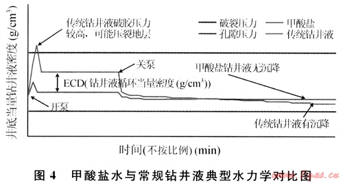 甲酸鹽鉆井液最大限度地降低了開泵時的瞬時峰壓、起下鉆時的抽汲激動壓力和循環(huán)壓力損失。Huldra A4井和A4ST井的循環(huán)當(dāng)量密度比較見表5,甲酸鹽水鉆井液與常規(guī)鉆井液典型水力學(xué)對比(圖4)。