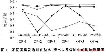 實驗分別考察了不同種類起泡劑在清水、鹽水、煤油以及鹽水和煤油的共同作用下的泡沫質量。結果表明非離子表面活性劑QP-1的效果最佳,鹽、油對其泡沫質量的影響小,其值均在0.75以上,故實驗優(yōu)選QP-1作為抗油防塌泡沫體系的發(fā)泡劑。