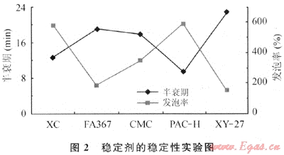 根據實驗結果,穩(wěn)定劑CMC的加入對發(fā)泡率的影響較小,且具有良好的穩(wěn)定能力;XC和PAC-H的加入雖然提高了半衰期,但發(fā)泡率較低;FA367和XY-27的穩(wěn)定能力差。實驗最終優(yōu)選CMC作為體系的穩(wěn)定劑。