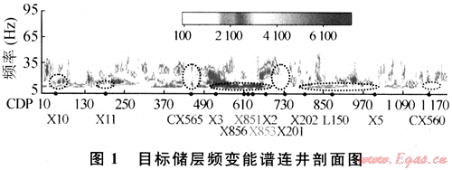 圖1所示是新場(chǎng)T511層頻變能譜連井剖面,重點(diǎn)關(guān)注的頻譜在橢圓區(qū)內(nèi)。圖中顯示,在該儲(chǔ)層段內(nèi),獲得高產(chǎn)工業(yè)氣流的X10、X3、X856、X851、X853、X2、X202等井在低頻段(低于15Hz)具有較強(qiáng)的瞬時(shí)譜響應(yīng);獲得低產(chǎn)工業(yè)氣流的IA50、X5等井在低頻段(低于15Hz)具有相對(duì)較弱的瞬時(shí)譜響應(yīng);未獲工業(yè)氣流的干井X11、CX560井和產(chǎn)水的CX565、X201井在低頻段無(wú)強(qiáng)瞬時(shí)譜響應(yīng)特征。