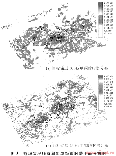 圖3所示是新場(chǎng)地區(qū)深層須家河組單頻瞬時(shí)譜平面分布情況,其顯示的瞬時(shí)譜具有十分明顯的差異。在圖3-a中,低頻強(qiáng)瞬時(shí)譜區(qū)域(紅色)包括了所有天然氣高產(chǎn)工業(yè)井,低產(chǎn)井分布在低頻弱瞬時(shí)譜區(qū)域(淺藍(lán)色),水井分布區(qū)域低頻瞬時(shí)譜更弱(白色)。在圖3-b中的多邊形框內(nèi),高頻強(qiáng)瞬時(shí)譜是泥巖響應(yīng),而高頻弱瞬時(shí)譜是有效砂巖儲(chǔ)層響應(yīng)。雖然,含氣儲(chǔ)層和含水儲(chǔ)層在高頻段有相似的響應(yīng)特征,但是,結(jié)合已知井信息,將圖3-a與圖3-b進(jìn)行仔細(xì)對(duì)比,就可以發(fā)現(xiàn)含氣儲(chǔ)層和含水儲(chǔ)層具有不同的時(shí)頻響應(yīng)規(guī)律。