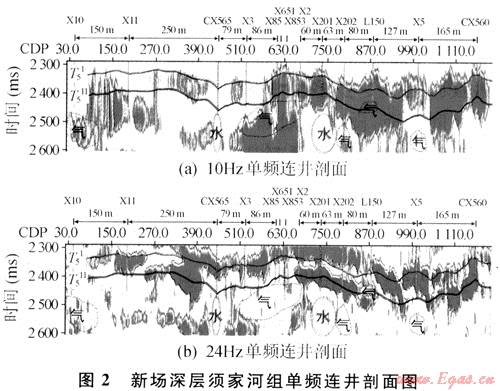 地震波在含氣儲(chǔ)層和含水儲(chǔ)層中傳播時(shí),振幅、頻率和能量等動(dòng)力學(xué)屬性將會(huì)發(fā)生變化。但是,兩者的變化程度可能存在差異,且在時(shí)間域內(nèi)卻很可能難以發(fā)現(xiàn)。時(shí)頻分析技術(shù)可以將時(shí)間域的地震信號(hào)變換到時(shí)間-頻率域進(jìn)行解釋,在時(shí)間-頻率域內(nèi)突出含氣儲(chǔ)層和含水儲(chǔ)層之間的地震響應(yīng)差異。將該方法應(yīng)用到川西坳陷深層須家河組氣藏的含氣性檢測(cè)中,在時(shí)頻域內(nèi)利用“低頻陰影”、“高頻衰減”等含氣響應(yīng)特征,對(duì)含氣儲(chǔ)層和含水儲(chǔ)層進(jìn)行了有效區(qū)分。