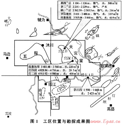五指山構(gòu)造區(qū)位于四川盆地西南邊緣,區(qū)域構(gòu)造屬于四川盆地川中隆起平緩構(gòu)造區(qū)及川東南坳陷帶,西鄰峨眉-涼山斷塊帶,北部緊鄰大窩頂鼻狀構(gòu)造,東側(cè)為自流井凹陷帶和威遠-龍女寺繼承隆起帶,南部為川滇黔鄂臺坳的婁山斷褶帶。區(qū)內(nèi)僅在天宮堂構(gòu)造完鉆了宮2井、宮深1井,樓東構(gòu)造上完鉆了樓東1井,測試均未獲得工業(yè)油氣流,但其鄰區(qū)的宜賓、大塔場、觀音場、麻柳場等構(gòu)造在二疊、三疊系均獲得了工業(yè)油氣流(圖1)。