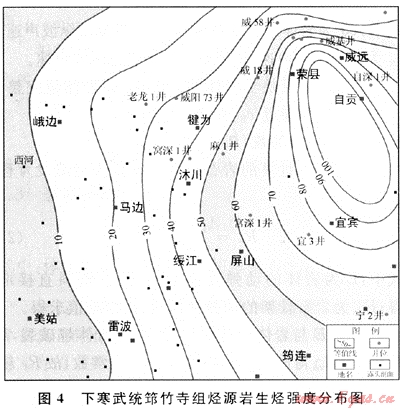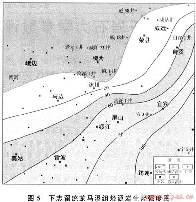根據(jù)區(qū)內(nèi)烴源巖情況,選用殘余有機碳法計算烴源巖的生烴強度。區(qū)內(nèi)4套烴源巖的平均生烴強度計算結(jié)果分別為:下寒武統(tǒng)筇竹寺組為63×108m3/km2、下志留統(tǒng)龍馬溪組為44.5×108m3/km2、下二疊統(tǒng)為11.5×108m3/km2、下三疊統(tǒng)嘉陵江組為0.85×108m3/km2。各烴源層生烴強度的展布特征如下:下寒武統(tǒng)筇竹寺組烴源巖生烴強度高值區(qū)位于工區(qū)北東側(cè)的榮縣-威遠-自貢一帶,最大生烴強度為100×108m3/km2,平均生烴強度位于珙縣-屏山-犍為-樂山一帶(圖4);下志留統(tǒng)龍馬溪組烴源巖生烴強度高值區(qū)位于工區(qū)東南側(cè)的宜賓-筠連一帶,最大生烴強度為100×108m3/km2,平均生烴強度位于美姑-綏江-自貢一帶(圖5)。