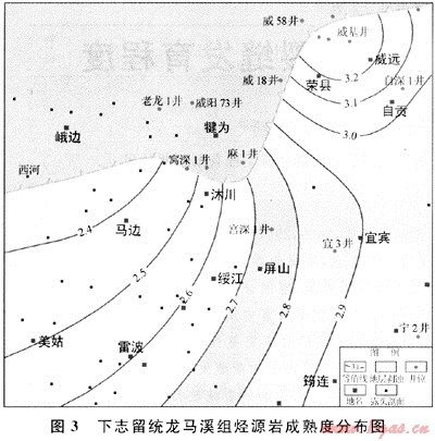 平面上,各層系烴源巖成熟度變化仍然較大:①下寒武統(tǒng)筇竹寺組烴源巖折算鏡質(zhì)體反射率最大,其烴源巖成熟度分布范圍為1.66%~4.31%,平均達2.5%,表明烴源巖已達過成熟階段,以產(chǎn)干氣為主。工區(qū)北側(cè)的犍為-樂山一帶烴源巖成熟度高,均已超過3.0%,西側(cè)的美姑-西河一帶烴源巖成熟度相對較低,約為2.1%,工區(qū)東南側(cè)的屏山-長寧-珙縣一帶烴源巖成熟度也相對較低,小于2.1%。②下志留統(tǒng)龍馬溪組烴源巖成熟度分布具有東側(cè)高西側(cè)低的特點,且烴源巖演化程度較高為2.4%~3.2%,平均達2.8%,烴源巖處于高成熟過成熟階段,以生氣為主。西側(cè)馬邊-陳子巖一帶烴源巖成熟度相對較低,約為2.4%(圖3)。③下二疊統(tǒng)烴源巖成熟度較高,為2.0%~2.7%,平均2.35%,烴源巖處于高成熟-過成熟階段,以生氣為主。在峨邊-樂山-威遠一帶烴源巖演化成度相對較低,為2.0%~2.1%;而工區(qū)南側(cè)和東南側(cè)的宜賓-屏山-雷波一帶烴源巖演化程度較高,為2.6%~2.7%。④下三疊統(tǒng)嘉陵江組烴源巖在各層系中成熟度最低,為1.0%~1.6%,平均為1.35%,烴源巖處于高成熟階段,以產(chǎn)濕氣為主,可產(chǎn)少量凝析油。