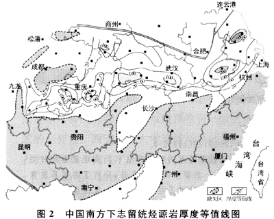 下志留統(tǒng)烴源巖集中分布于龍馬溪組(高家邊組)底部,厚度一般為30~100m,分布幾乎遍及整個揚子區(qū)。有機碳含量較高,多屬最好的烴源巖,為中國南方最重要的烴源層之一。中上揚子區(qū)龍馬溪組以黑色筆石泥頁巖為主,呈現(xiàn)多個烴源巖發(fā)育中心(圖2)。下?lián)P子區(qū)與龍馬溪組對應(yīng)層段被稱為高家邊組,主要為淺海相黑色硅質(zhì)泥巖、灰色泥巖,存在揚州-興化和石臺-廣德2個烴源巖發(fā)育中心。