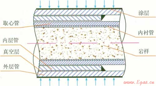 系統(tǒng)保溫筒設計如圖2,采用超高真空絕熱方式,在內(nèi)層管、外層管間抽真空;高真空層內(nèi)外表面噴涂等離子隔熱材料;外層管表面涂防陽光輻射涂料;在取心筒外面直接用保溫材料實施保溫。保溫結(jié)構(gòu)設計簡單,現(xiàn)場可操作性強,使用方便。
