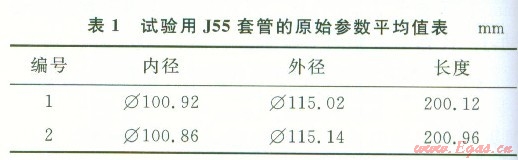 試驗中使用APl標準的J55套管(Φ=ll4.30mm,壁厚6.88 mm),其化學成分(質量分數(shù),%)為:0.35C,0.31Si,1.39Mn,0.017Ni,0.092M0,0.19Cr,0.004S,0.014P,對兩段套管的實測原始參數(shù)如表1所示。
