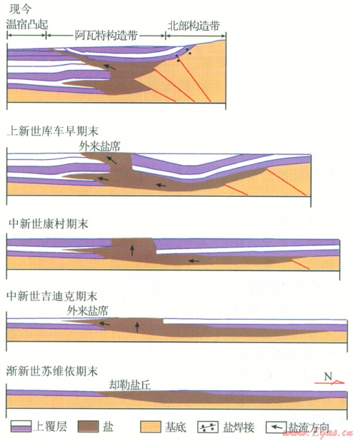 4)吐孜阿瓦特構(gòu)造主要分為2期:①早期發(fā)育鹽底辟構(gòu)造,吐孜阿瓦特南北兩翼發(fā)育鹽丘;②上新世南天山開(kāi)始強(qiáng)烈抬升,吐孜阿瓦特地區(qū)受到強(qiáng)烈擠壓,發(fā)育鹽下逆沖斷層。