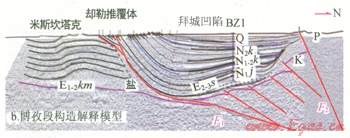 博孜段淺層為寬緩的向斜,構(gòu)造變形微弱,同構(gòu)造沉積特征清晰。淺層向斜北翼E2-3s發(fā)生前積作用,厚度由北往南減薄,表明漸新世鹽巖在沉積差異負(fù)載作用下發(fā)生流動(dòng)變形,形成早期鹽撤凹陷;N1j—N1-2k下段地層基本等厚,僅在BZl井北側(cè)發(fā)生微弱加厚;N1-2k上段和N2k—Q呈北薄南厚的楔狀,地層傾角從深層到淺層變緩,為大型扇狀生長(zhǎng)地層,表明博孜段淺層向斜(晚期鹽撤凹陷)開(kāi)始形成于中新世晚期,并持續(xù)到現(xiàn)今。博孜段下伏鹽巖發(fā)生側(cè)向流動(dòng)減薄,淺層凹陷北翼與基底直接接觸,發(fā)育鹽焊接構(gòu)造。基底發(fā)育隱伏斷層,形成疊瓦狀逆沖構(gòu)造,造成博孜段北翼抬升。
