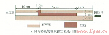 在水平面上。基底石英砂厚度2 cm,模擬實(shí)際基底地層4 km,硅膠厚度1 cm,模擬實(shí)際鹽層厚度2 km。該實(shí)驗(yàn)基底無(wú)滑脫層,用石英砂模擬硬性地層,用硅膠模擬鹽巖(圖3-a)。