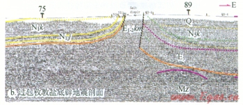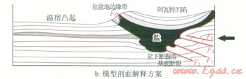 在鹽的滑脫作用下,鹽上層變形與鹽下層變形不協(xié)調(diào)。鹽上層主要表現(xiàn)為幅度很小的向斜盆地和推覆距離很大的逆沖推覆體,鹽下前緣斷層在擠壓作用下即開(kāi)始形成,直至擠壓最終結(jié)束,始終在活動(dòng)。而鹽上負(fù)載則在鹽的滑脫作用下推覆至鹽盆地南邊的硬性地層之上,并由于鹽的聚集作用和基底的抬升作用,鹽上