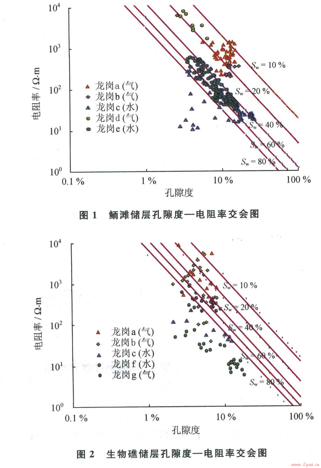 這是一組截距僅隨Sw而變的直線,輸入龍崗地區(qū)白云巖儲(chǔ)層的巖性骨架參數(shù)和Rw值,建立該區(qū)孔隙度一電阻率交會(huì)圖版(圖1、2),根據(jù)交會(huì)點(diǎn)子分布范圍判別儲(chǔ)層流體類型。