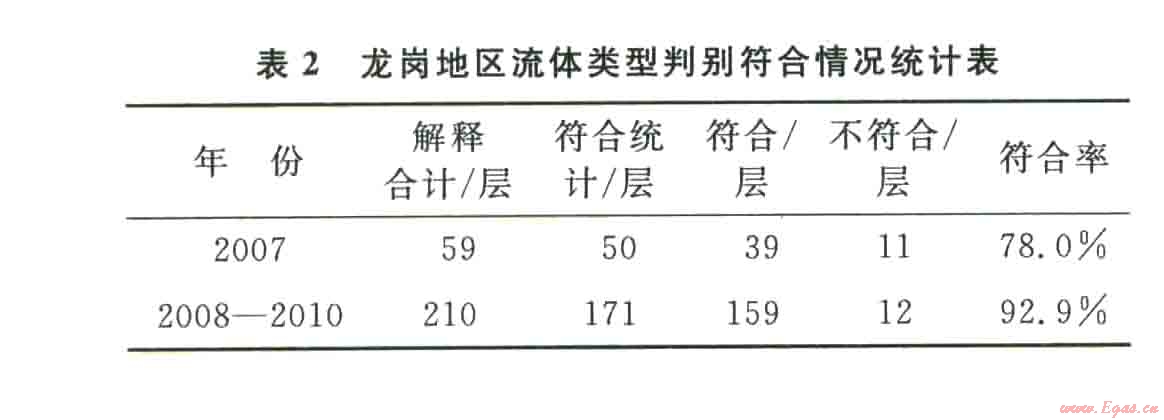 3應(yīng)用效果 將復(fù)雜礁灘氣藏儲(chǔ)層流體識(shí)別的上述技術(shù)應(yīng)用于龍崗地區(qū),取得了很好的效果。2008年以前,傳統(tǒng)方法判別符合率僅78%,2008年到2010年通過新方法的應(yīng)用,解釋符合率得到了極大的提高,根據(jù)該氣藏飛仙關(guān)組和長(zhǎng)興組已試油證實(shí)產(chǎn)流體情況的210層來看,符合統(tǒng)計(jì)要求的共l71層,符合l59層,不符合12層,流體類型判別符合率平均達(dá)到92.9%(表2)。