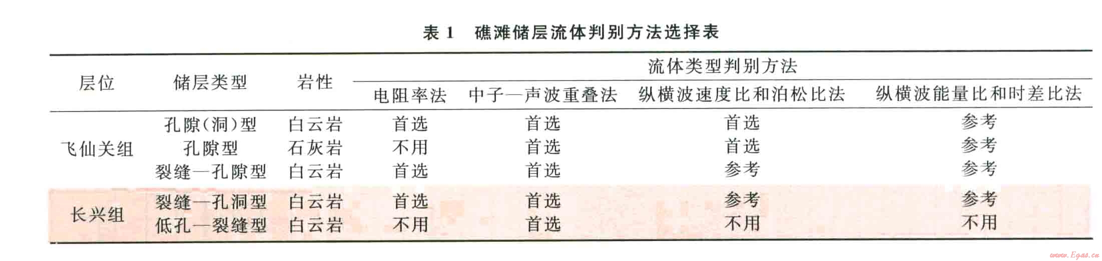 以上研究表明,每種流體識(shí)別方法均有各自的特點(diǎn)和適用性,為便于現(xiàn)場(chǎng)生產(chǎn)中應(yīng)用,針對(duì)龍崗地區(qū)飛仙關(guān)組和長(zhǎng)興組的不同巖性、不同儲(chǔ)集類型儲(chǔ)層確立了最優(yōu)的流體判別方法優(yōu)選(表1):飛仙關(guān)組儲(chǔ)層可選擇電阻率法、中子聲波重疊法、縱橫波速度比或泊松比法、縱橫波能量比和時(shí)差比重疊法來判別流體類型;長(zhǎng)興組儲(chǔ)層可選擇電阻率法、中子一聲波重疊法來判別流體類型,縱橫波速度比或泊松比法、縱橫波能量比和時(shí)差比重疊法可以作為參考。
