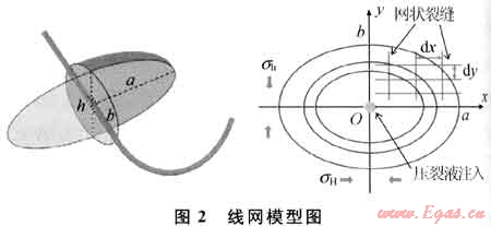 線網(wǎng)模型為半解析模型(圖2),泄流區(qū)域呈橢圓形,有兩組垂直正交的裂縫分別平行于橢圓平面上兩個主應力(σh、σH),為避免裂縫間距的主觀性,dx、dy依據(jù)實際測試數(shù)據(jù)確定,橢圓的長短軸a和b以及高度h由微地震結果給出。