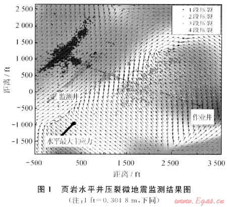 常規(guī)壓裂形成的裂縫一般呈雙翼對稱裂縫的形式。但頁巖氣壓裂中微地震監(jiān)測的結果表明,裂縫的形態(tài)復雜多變,如圖1所示[2]。1口水平井壓裂后微地震監(jiān)測結果表明,第1、2段壓裂施工形成了垂直于水平井段的平面縫,第3、4段施工形成了網(wǎng)狀裂縫。目前認為頁巖氣壓裂目的,就是要建立一個獨立于傳統(tǒng)意義裂縫半長的更加龐大的裂縫網(wǎng)絡系統(tǒng),實現(xiàn)更大規(guī)模的儲層改造波及體積;生產(chǎn)實踐也證明了儲層改造體積越大壓后增產(chǎn)效果越好。