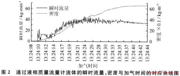 從圖2中可以看到加氣機(jī)從加氣開始,瞬時(shí)流量快速波動(dòng)上升,而密度以一定斜率緩慢上升。從13:24:10開始加氣到13:24:35密度趨于穩(wěn)定,約有20s時(shí)間流量計(jì)流過(guò)的介質(zhì)處于氣液兩相流狀態(tài)。加氣機(jī)通過(guò)控制控制閥1和控制閥2的動(dòng)作順序可以有效避免由于測(cè)量介質(zhì)存在氣液兩相而造成的計(jì)量不準(zhǔn)問題,具體工作原理為:當(dāng)加氣機(jī)開始加氣時(shí),控制閥1關(guān)閉,控制閥2打開,此時(shí)流量計(jì)測(cè)量流體狀態(tài),但不參與計(jì)量;當(dāng)流體狀態(tài)達(dá)到測(cè)量要求時(shí),控制閥2關(guān)閉,同時(shí)打開控制閥1,測(cè)試流量計(jì)開始計(jì)量,完成加注任務(wù)。