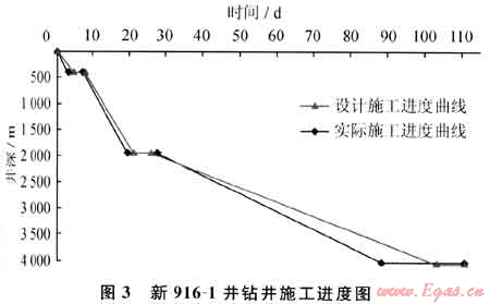 從本井時效分析結(jié)果可知,全井鉆井總臺時為2121.5h,臺月效率為1366.10m/臺月,高于設(shè)計值15.94%;純鉆率為57.31%,高于沒計值15.26%;全井平均鉆速為3.31m/h,高于設(shè)計值0.61%。事故率為0,鉆井周期為88.4d,平均機械鉆速為3.31m/h,實現(xiàn)了以須四段為目的層的4000m定向深井105d完鉆的提速奮斗目標,并較提速目標提前16.60d,創(chuàng)造了川西地區(qū)4000m定向深井鉆井周期最短紀錄(施工進度如圖3所示)。
