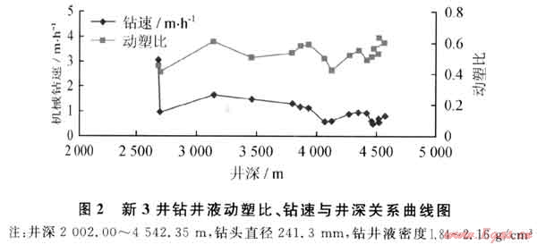 從實鉆資料可以看出(圖2),川西地區(qū)在3000m以前,提高鉆井液動塑比有利于提高鉆井機械鉆速,但是隨著井深的增加,3000m以后,盡管鉆井液動塑比有效提升,但是鉆井機械鉆速仍然很低,并且隨著井深的增加呈降低的趨勢。